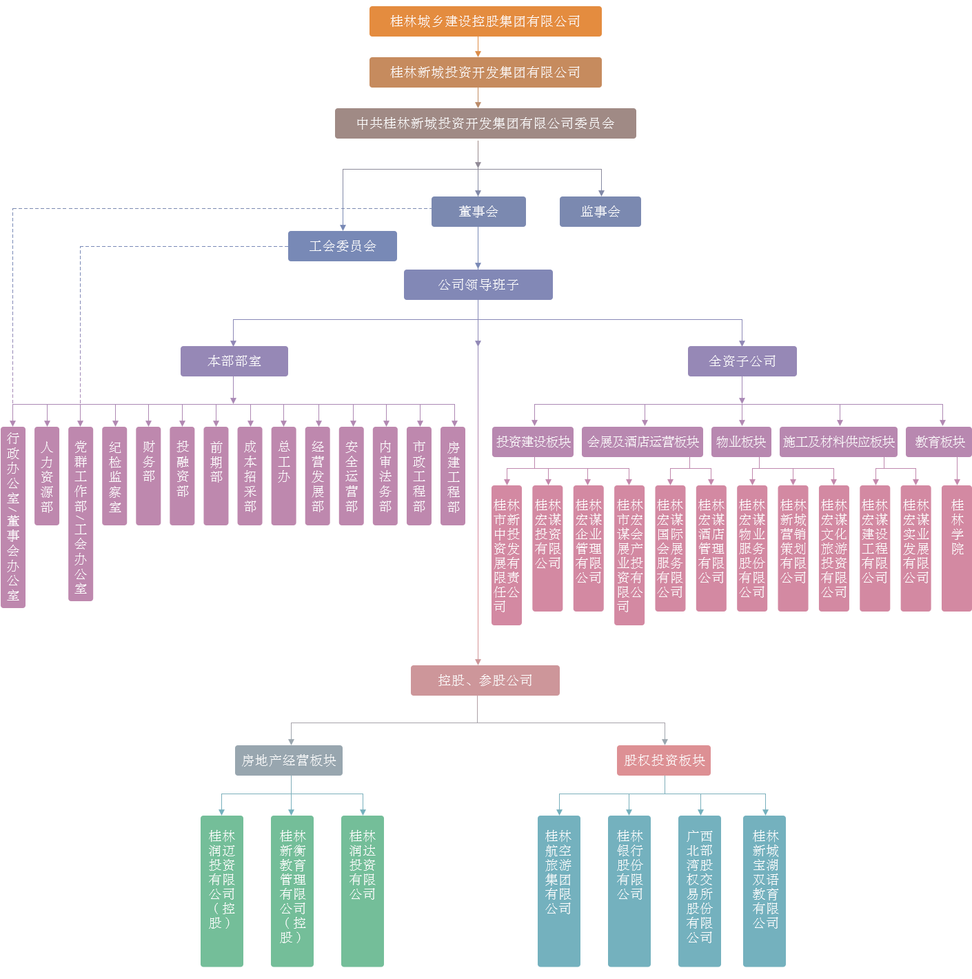 公司下設(shè)12個(gè)全資子公司,分為五大板塊,其中(一)投資建設(shè)板塊:桂林市新中投資發(fā)展有限責(zé)任公司、桂林宏謀投資有限公司、桂林宏謀企業(yè)管理有限公司、桂林市宏謀會(huì)展產(chǎn)業(yè)投資有限公司;(二)會(huì)展及酒店運(yùn)營(yíng)板塊:桂林宏謀國(guó)際會(huì)展服務(wù)有限公司、桂林宏謀酒店管理有限公司;(三)物業(yè)板塊:桂林宏謀物業(yè)服務(wù)股份有限公司、桂林新城營(yíng)銷策劃有限公司、桂林宏謀文化旅游投資有限公司;(四)施工及材料供應(yīng)板塊:桂林宏謀建設(shè)工程有限公司、桂林宏謀實(shí)業(yè)發(fā)展有限公司;(五)教育板塊:桂林學(xué)院。