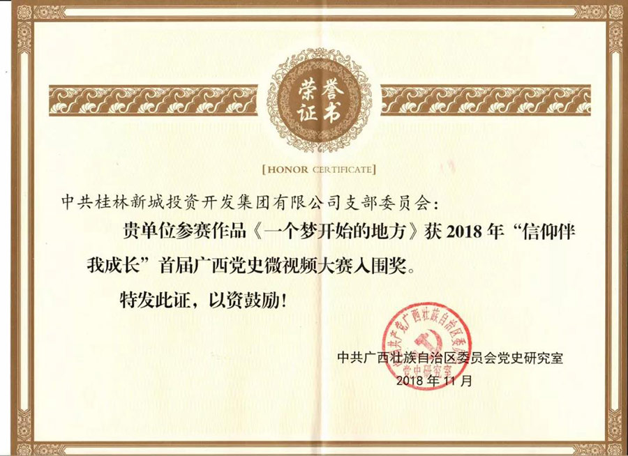 近日,在廣西壯族自治區(qū)黨委黨史研究室、廣西電視臺(tái)主辦的“信仰伴我成長(zhǎng)”首屆廣西黨史微視頻大賽頒獎(jiǎng)儀式上,新城投資集團(tuán)黨支部選送的參賽作品《臨桂新區(qū) 一個(gè)夢(mèng)開(kāi)始的地方》榮獲入圍獎(jiǎng)。