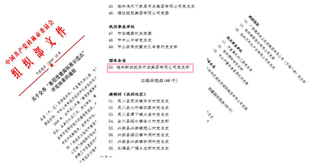 2018年,桂林市深入開展 “基層黨建高標(biāo)準(zhǔn)示范點(diǎn)”創(chuàng)建活動(dòng),各單位扎實(shí)工作、突出特色、著力打造,形成了一批具有示范帶動(dòng)能力的基層黨組織,新城投資集團(tuán)黨支部被評(píng)為“桂林市基層黨建工作四星級(jí)示范點(diǎn)”。