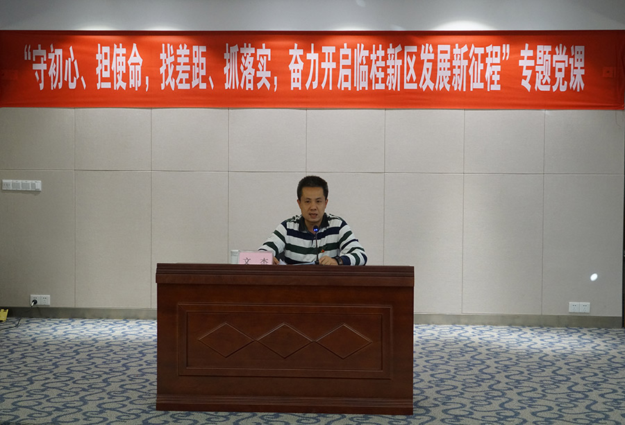 11月4日,按照主題教育安排部署,臨桂新區(qū)工委委員、管委會副主任文杰以“守初心、擔(dān)使命,找差距、抓落實,奮力開啟臨桂新區(qū)發(fā)展新征程”為主題,為新城投資集團(tuán)全體黨員、積極分子、中層副職以上干部上了一堂專題黨課。