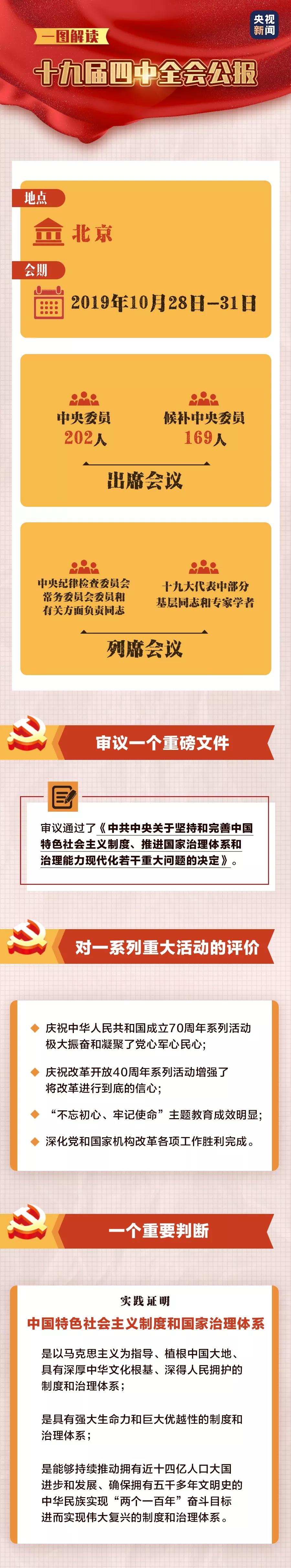 黨的十九屆四中全會在北京勝利閉幕,這是在慶祝新中國成立70周年的重要節(jié)點(diǎn),向全面建成小康社會、實(shí)現(xiàn)第一個百年奮斗目標(biāo)邁進(jìn)的關(guān)鍵之年召開的一次重要會議,充分肯定我們黨治理國家取得的歷史性成就,全面總結(jié)我國國家制度和國家治理體系的顯著優(yōu)勢,明確了加強(qiáng)和完善國家治理必須堅(jiān)持的基本原則以及總體目標(biāo)、工作要求,為堅(jiān)定制度自信、實(shí)現(xiàn)偉大夢想提供了根本遵循,指明了正確方向。