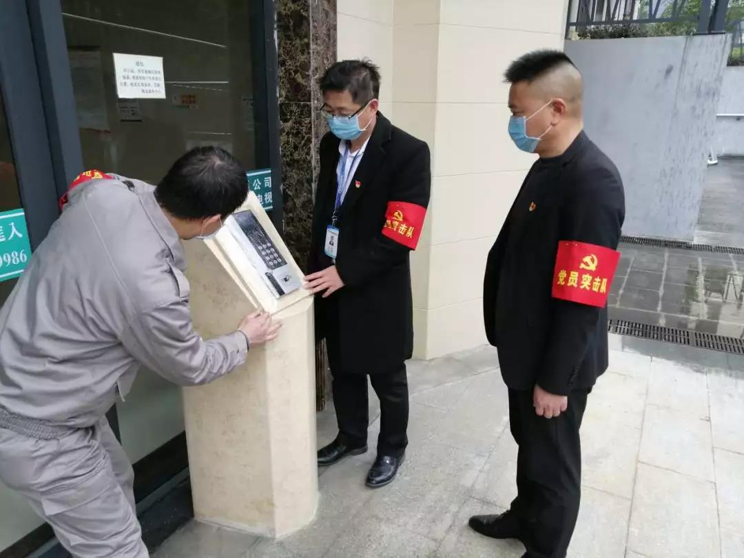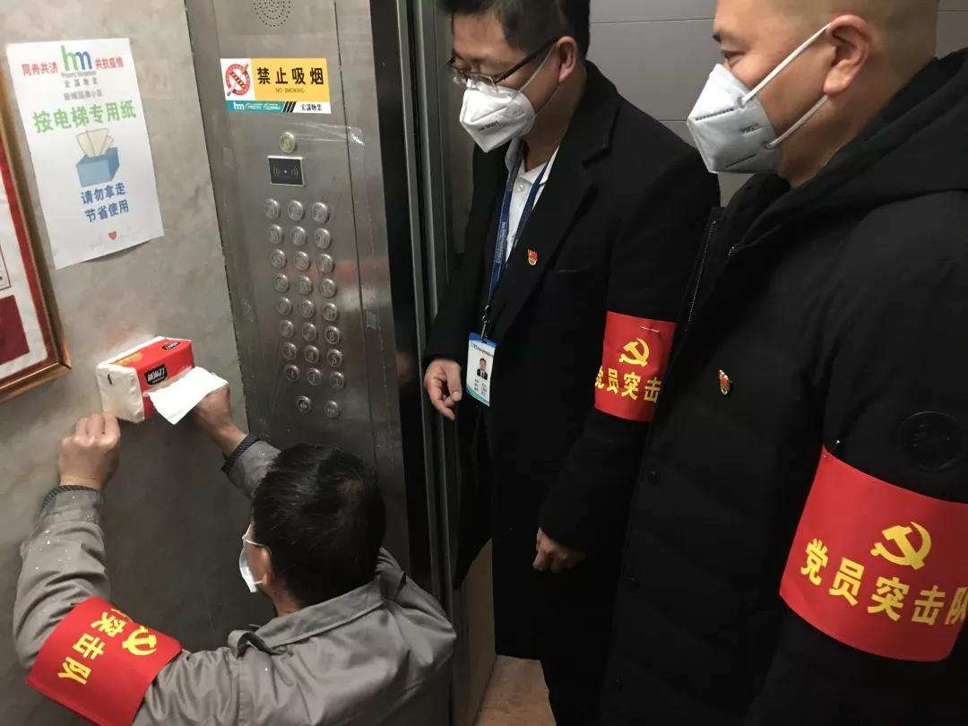 ▲黨員突擊隊(duì)正在更換小區(qū)對(duì)講系統(tǒng)、電梯按鍵防菌用塑料膜和按電梯專(zhuān)用紙。