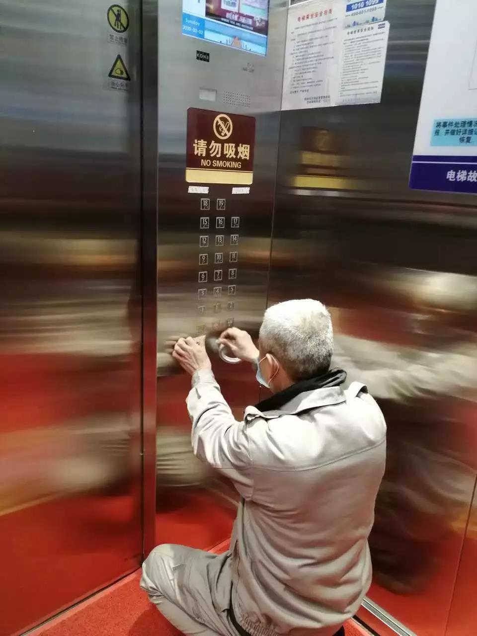 ▲工程人員為電梯按鍵貼上每天一換的塑料膜。