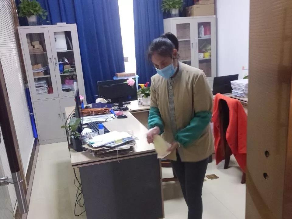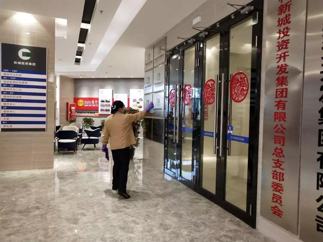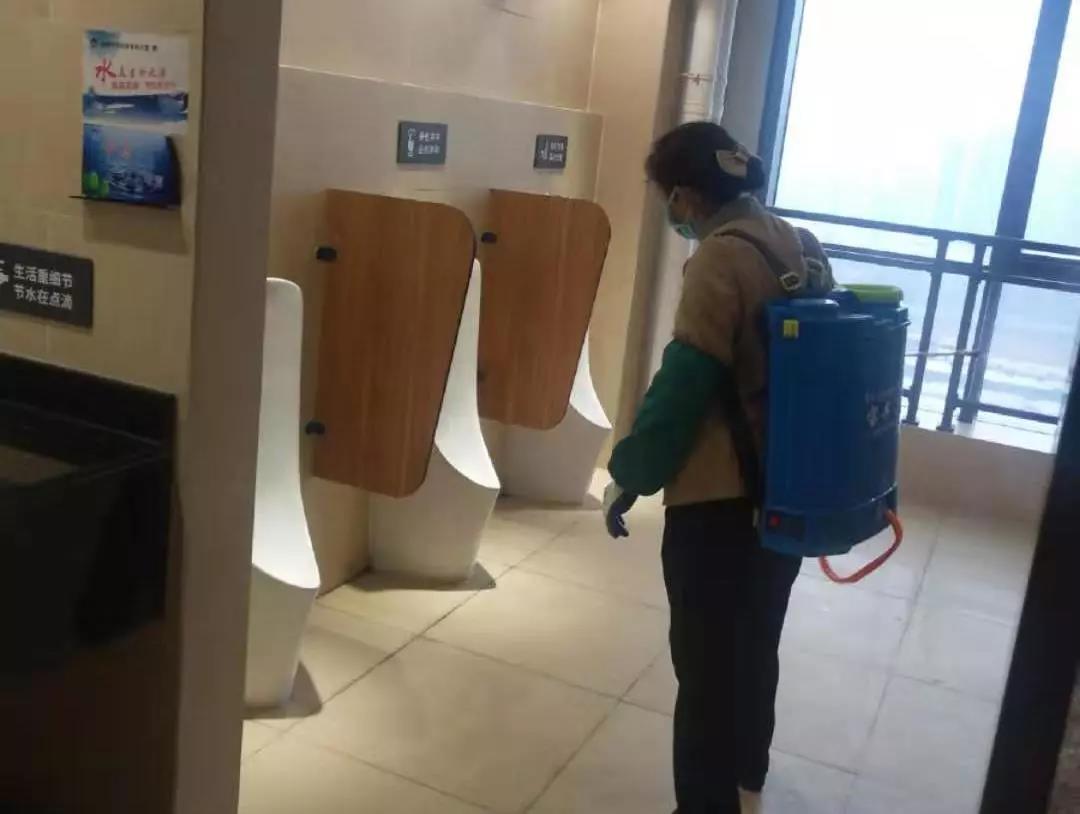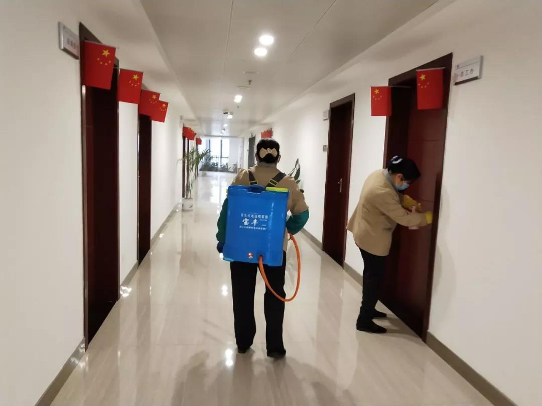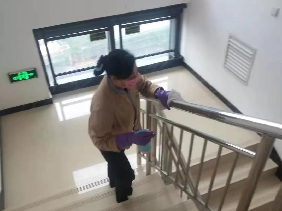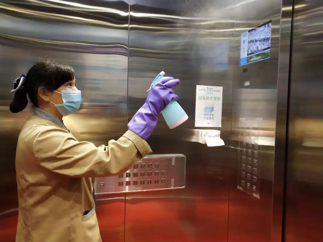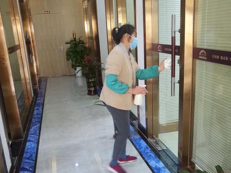▲保潔人員在對(duì)電梯、出入門(mén)廳、辦公區(qū)域、樓梯間、衛(wèi)生間等地進(jìn)行全面消毒。