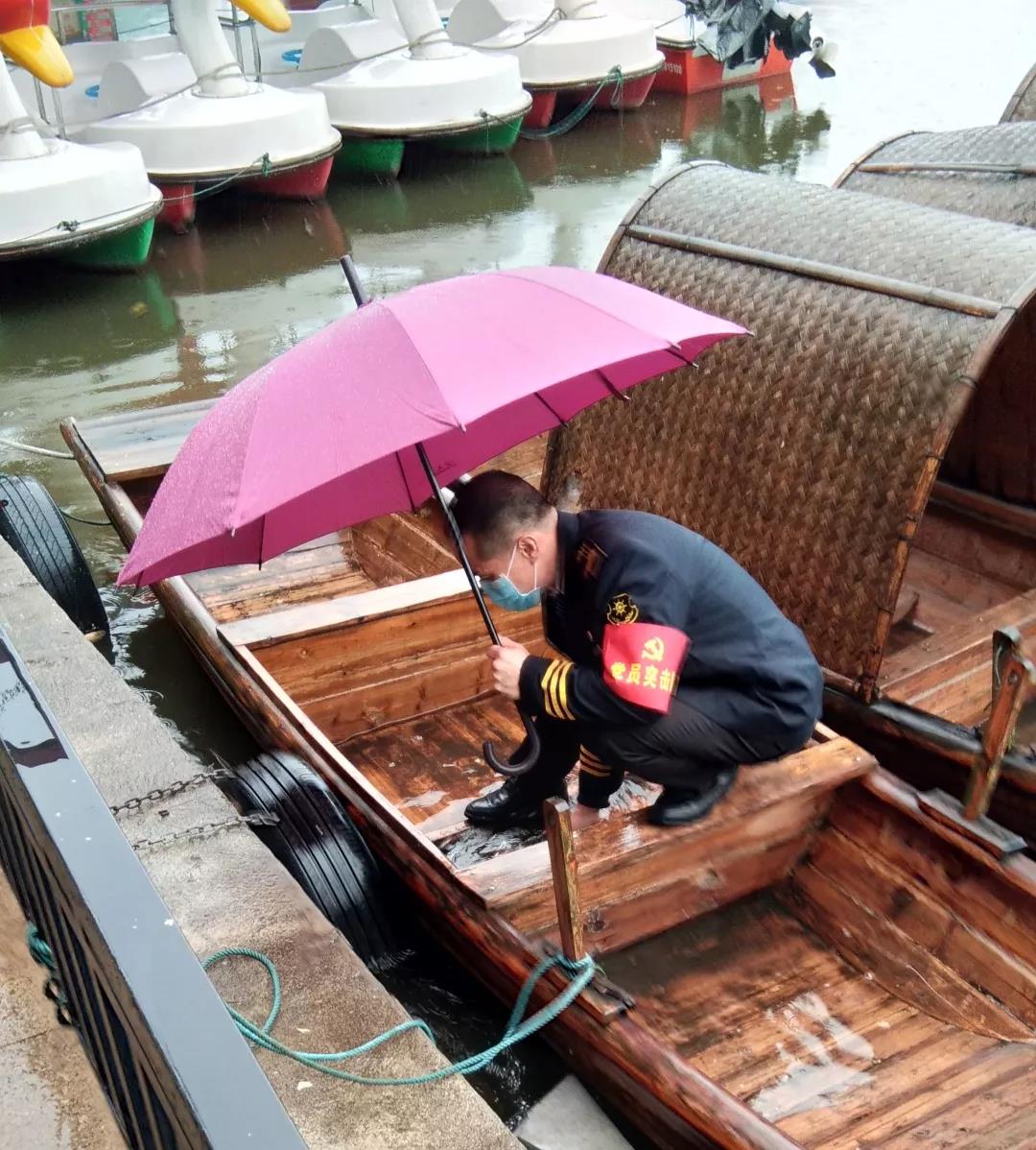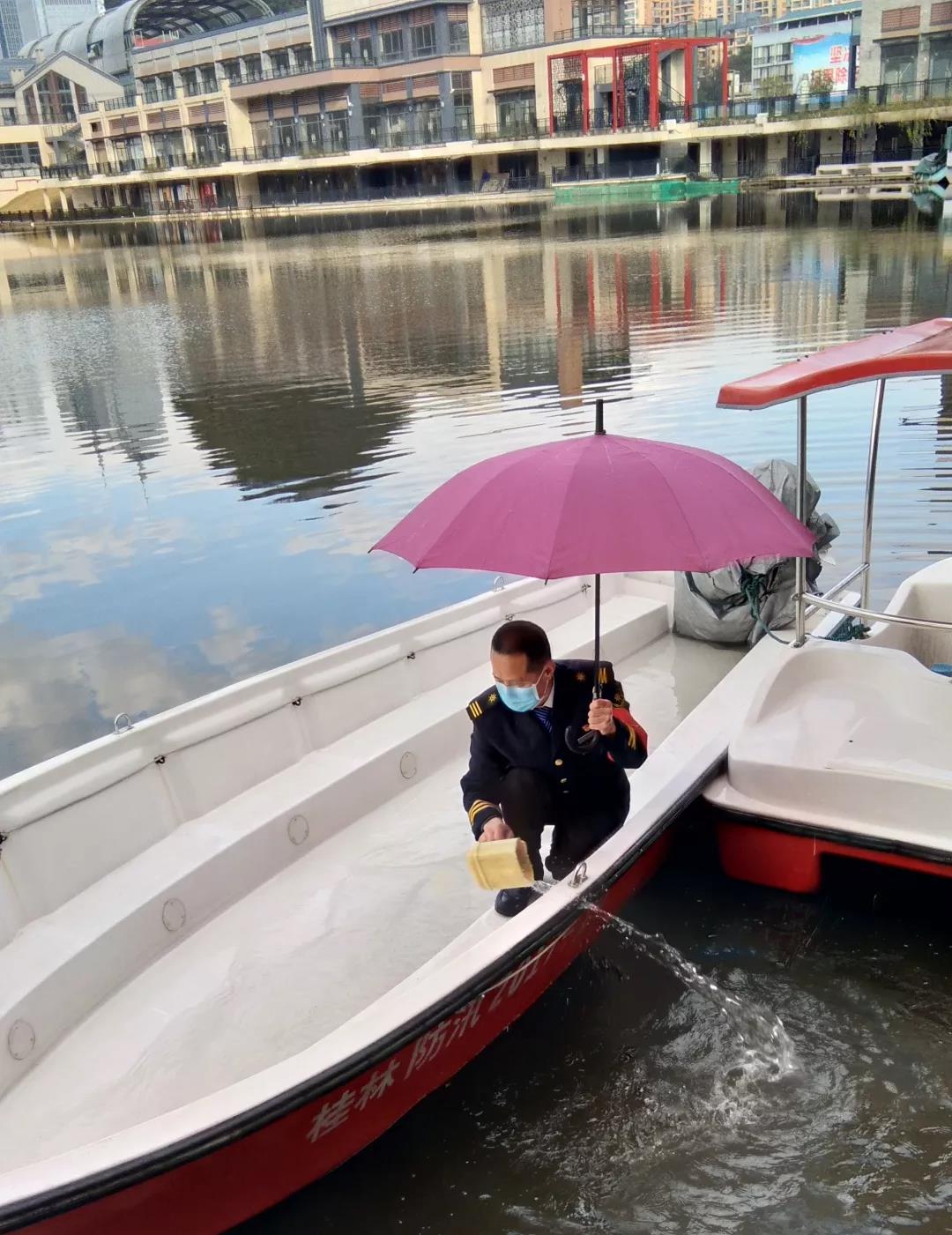 ▲黨員突擊隊(duì)成員黃雙財(cái)同志一人處理游船積水。