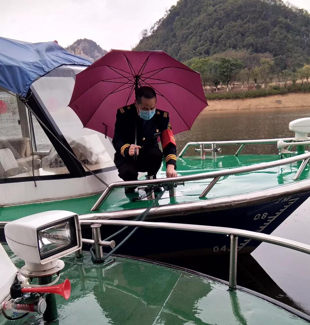 ▲為了保持船舶的技術(shù)狀態(tài)良好和安全,黃雙財(cái)同志冒雨對(duì)船舶進(jìn)行保養(yǎng),頂著大風(fēng)對(duì)系泊設(shè)施設(shè)備進(jìn)行安全檢查。