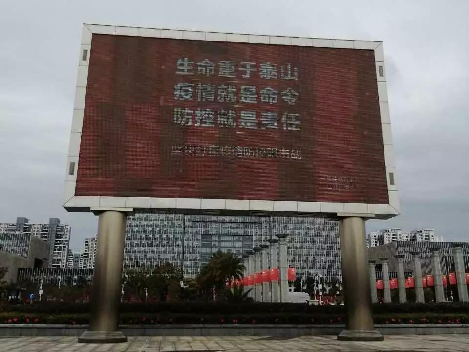 ▲市民廣場(chǎng)LED屏幕播放防疫宣傳信息。