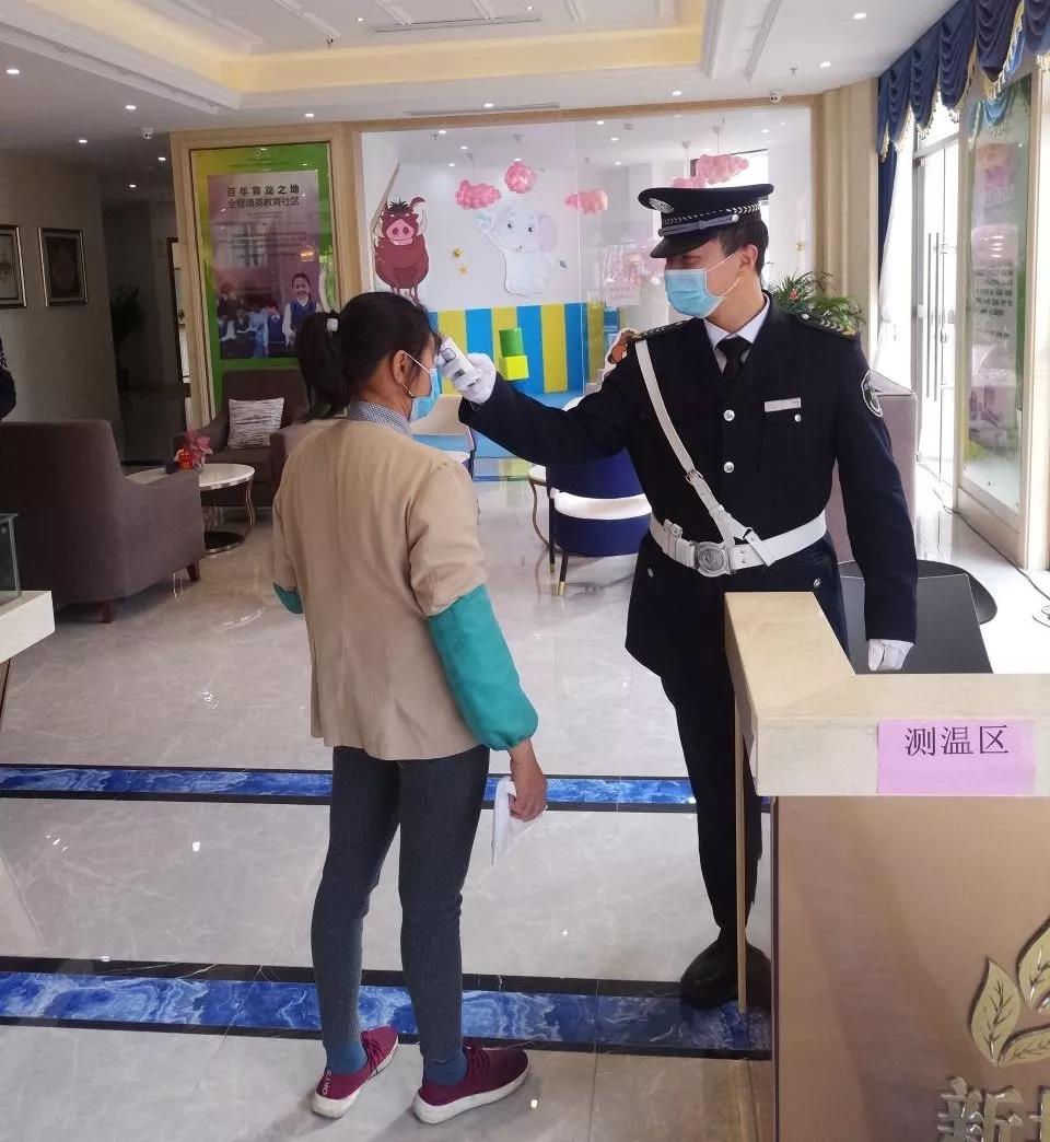 ▲新城國(guó)奧花園營(yíng)銷(xiāo)中心疫情防控崗在為保潔人員測(cè)體溫。