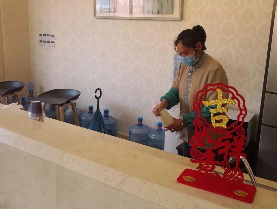 ▲保潔人員在對(duì)各門(mén)把手、茶水吧臺(tái)、辦公區(qū)域全面消毒。