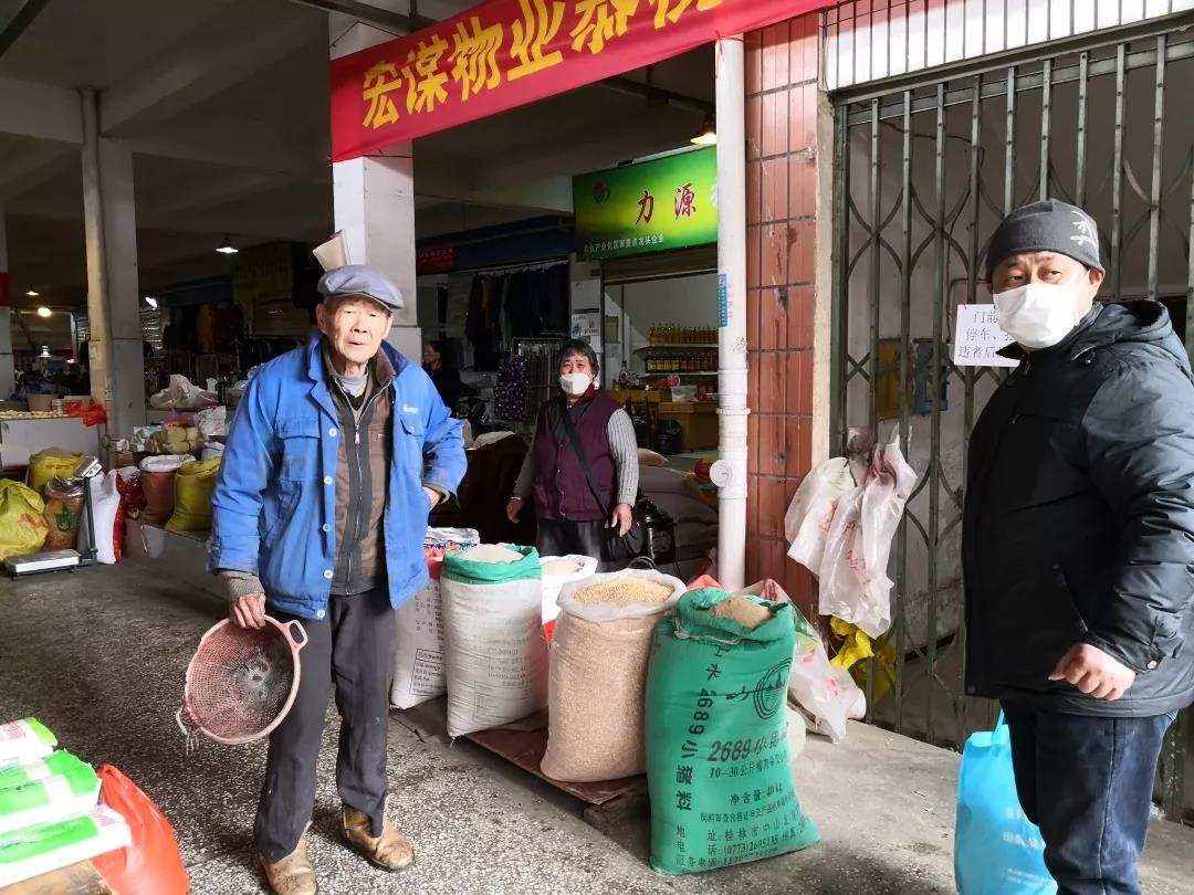 ▲橡膠公司項(xiàng)目工作人員與市場(chǎng)管理人員對(duì)市場(chǎng)及各門(mén)面進(jìn)行防疫工作排查,并提醒市民戴口罩出行。