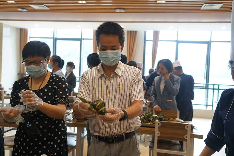 在集團(tuán)公司會場,工會會員宏謀酒店廚師鄧軍紅現(xiàn)場教學(xué),教大家包正宗的宏謀粽子。現(xiàn)場員工現(xiàn)學(xué)現(xiàn)包,各顯神通,歡快的展示自己的作品。