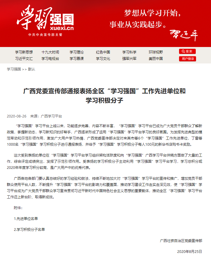 附:《廣西黨委宣傳部通報表揚全區(qū)“學(xué)習(xí)強(qiáng)國”工作先進(jìn)單位和學(xué)習(xí)積極分子》
