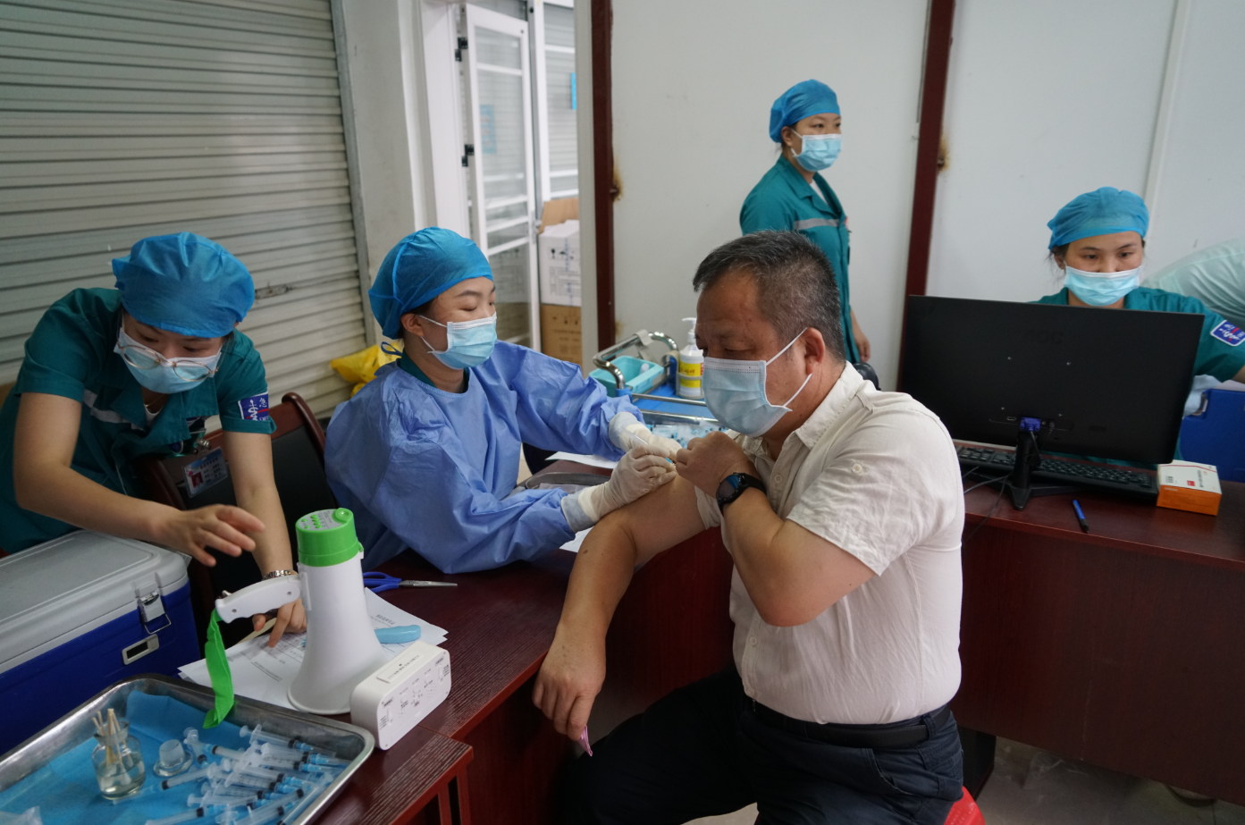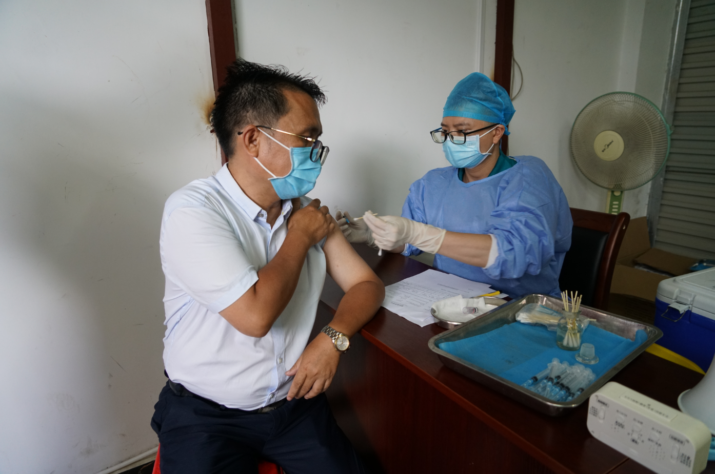 第二針接種流程與第一針相同,現(xiàn)場(chǎng)分為登記區(qū)、錄入?yún)^(qū)、接種區(qū)、留觀(guān)區(qū)和緊急處置區(qū)。集團(tuán)黨總支書(shū)記周道林,副總經(jīng)理吳濤,工會(huì)主席譚力源等到現(xiàn)場(chǎng)了解接種現(xiàn)場(chǎng)安排情況并帶頭接種新冠疫苗第二針。