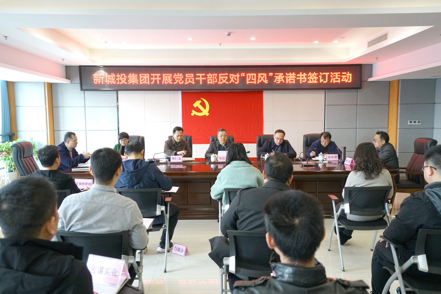 為進(jìn)一步深入貫徹習(xí)近平總書(shū)記關(guān)于進(jìn)一步糾治“四風(fēng)”、加強(qiáng)作風(fēng)建設(shè)的論述,深入開(kāi)展黨員干部涉酒違紀(jì)違法問(wèn)題專項(xiàng)整治工作,近日,新城投集團(tuán)組織公司班子成員,各部室、子公司負(fù)責(zé)人等黨員干部簽訂《黨員干部和公職人員反對(duì)“四風(fēng)”承諾書(shū)》,公開(kāi)承諾帶頭自覺(jué)糾正“四風(fēng)”,持之以恒貫徹落實(shí)中央八項(xiàng)規(guī)定及其實(shí)施細(xì)則精神,主動(dòng)接受監(jiān)督。集團(tuán)黨總支書(shū)記、董事長(zhǎng)周道林主持會(huì)議。集團(tuán)領(lǐng)導(dǎo)班子成員,各部室、子公司負(fù)責(zé)人參加會(huì)議。