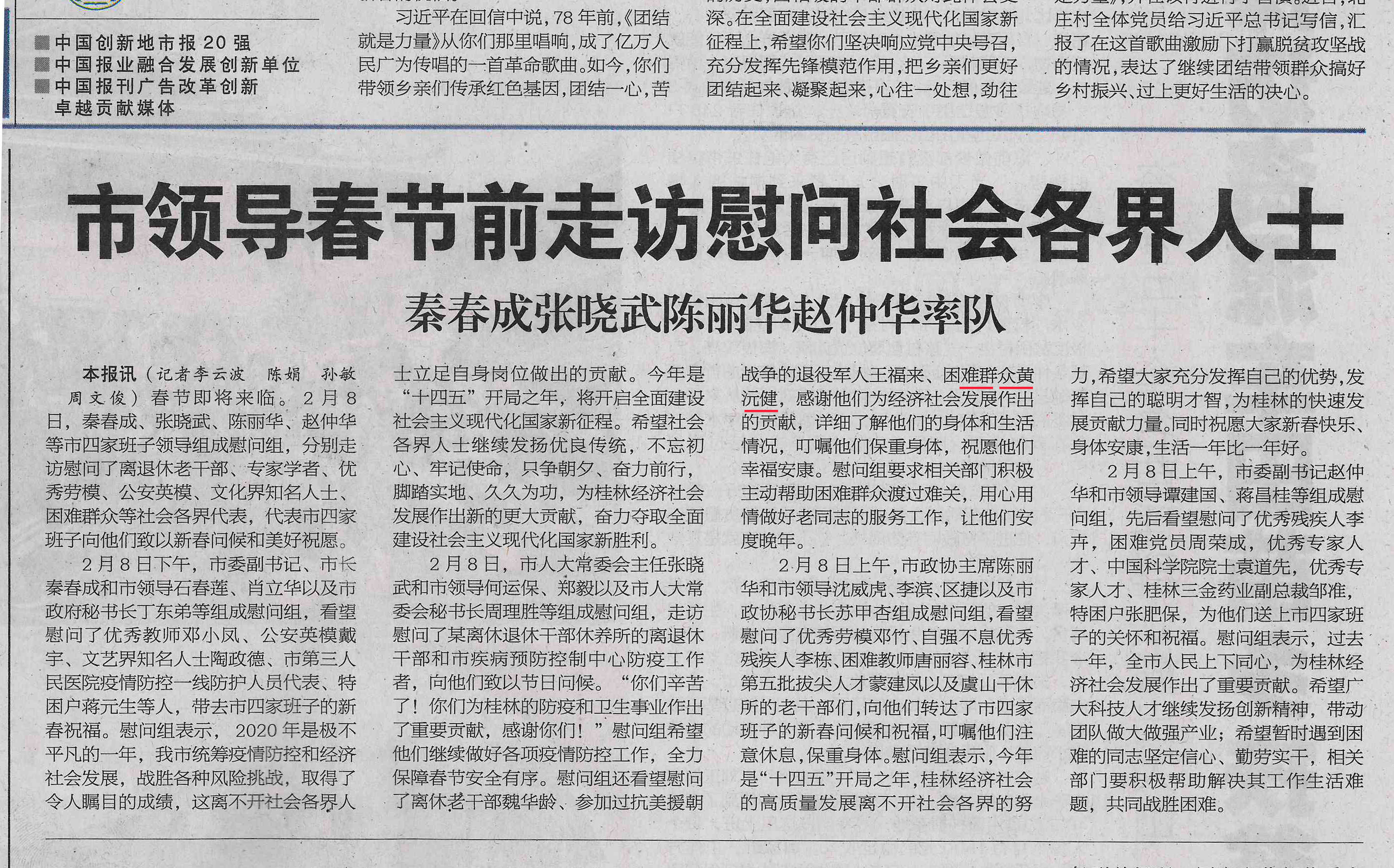 2月8日,市人大常委會(huì)主任張曉武和市領(lǐng)導(dǎo)何運(yùn)保、鄭毅以及市人大常委會(huì)秘書長周理勝等組成慰問組,走訪慰問了桂林新城投資集團(tuán)困難職工黃沅健。