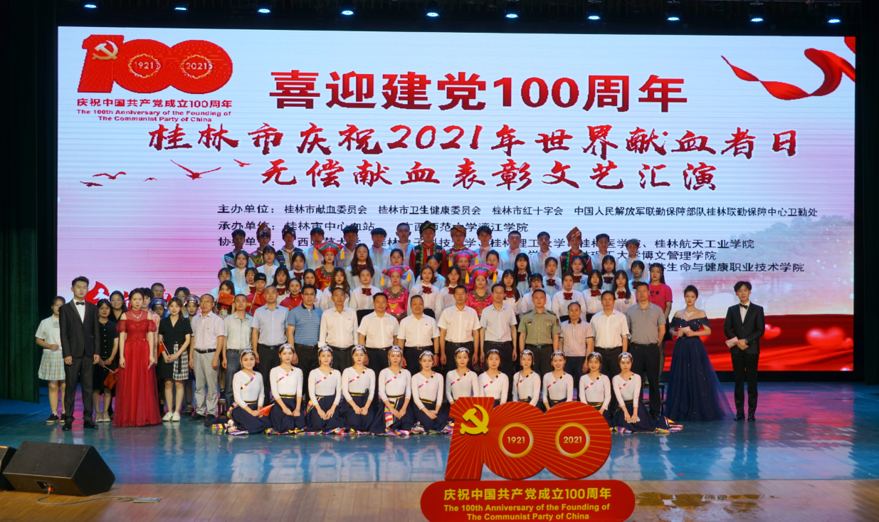 6月9日,由桂林市獻(xiàn)血委員會、桂林市衛(wèi)生健康委員會、桂林市紅十字會、中國人民解放軍聯(lián)勤保障部隊桂林聯(lián)勤保障中心衛(wèi)勤處主辦,桂林市中心血站、廣西師范大學(xué)漓江學(xué)院承辦的“喜迎建黨100周年桂林市慶祝2021年世界獻(xiàn)血者日無償獻(xiàn)血表彰文藝匯演”活動在漓江學(xué)院召開。漓江學(xué)院獲得全場唯一“全國無償獻(xiàn)血促進(jìn)獎單位獎”。
