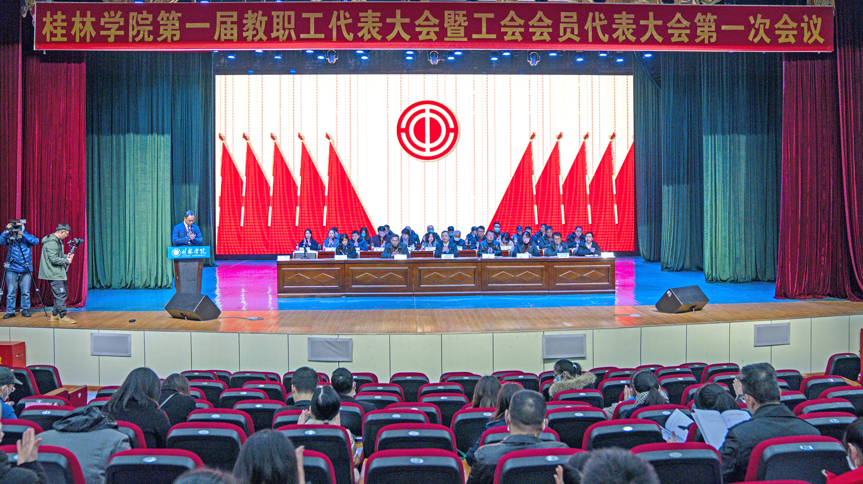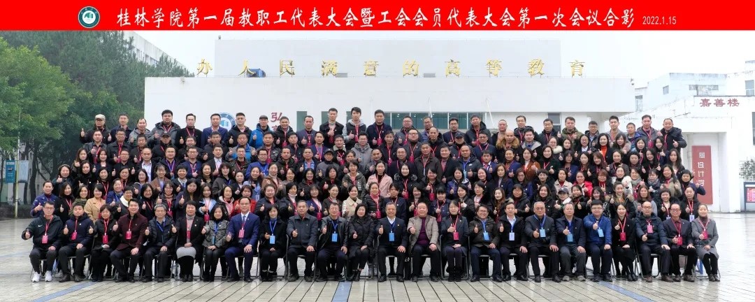 2022年1月15日上午,桂林學院第一屆教職工代表大會暨工會會員代表大會第一次會議在學校弘善講堂召開。市總工會黨組成員、副主席、教育工會主席莫曦媛,市教育工會常務副主席陳東,新城投資集團黨總支書記、董事長、桂林學院董事長周道林,新城投資集團副總經理、桂林學院副董事長鄭善華出席會議。桂林學院校長楊樹喆等大會主席團成員在主席臺就座。桂林學院黨組織負責人唐文紅主持會議。正式代表、特邀代表、列席代表近150人參加大會。