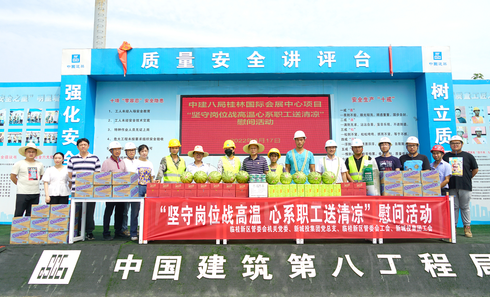 入伏以來(lái),我市驕陽(yáng)似火,高溫難耐。為切實(shí)做好桂林新區(qū)重點(diǎn)項(xiàng)目建設(shè)者的防暑降溫工作,保障建設(shè)者安全度伏,促進(jìn)重大項(xiàng)目安全生產(chǎn),2022年8月17日,一場(chǎng)由臨桂新區(qū)管委會(huì)機(jī)關(guān)黨委和新城投集團(tuán)黨總支主辦,新區(qū)管委會(huì)工會(huì)和新城投集團(tuán)工會(huì)承辦的“堅(jiān)守崗位戰(zhàn)高溫,心系職工送清涼”慰問(wèn)活動(dòng)依次在北區(qū)湖塘水系連通工程項(xiàng)目、國(guó)際會(huì)展中心項(xiàng)目、興桂園項(xiàng)目建設(shè)一線開展。