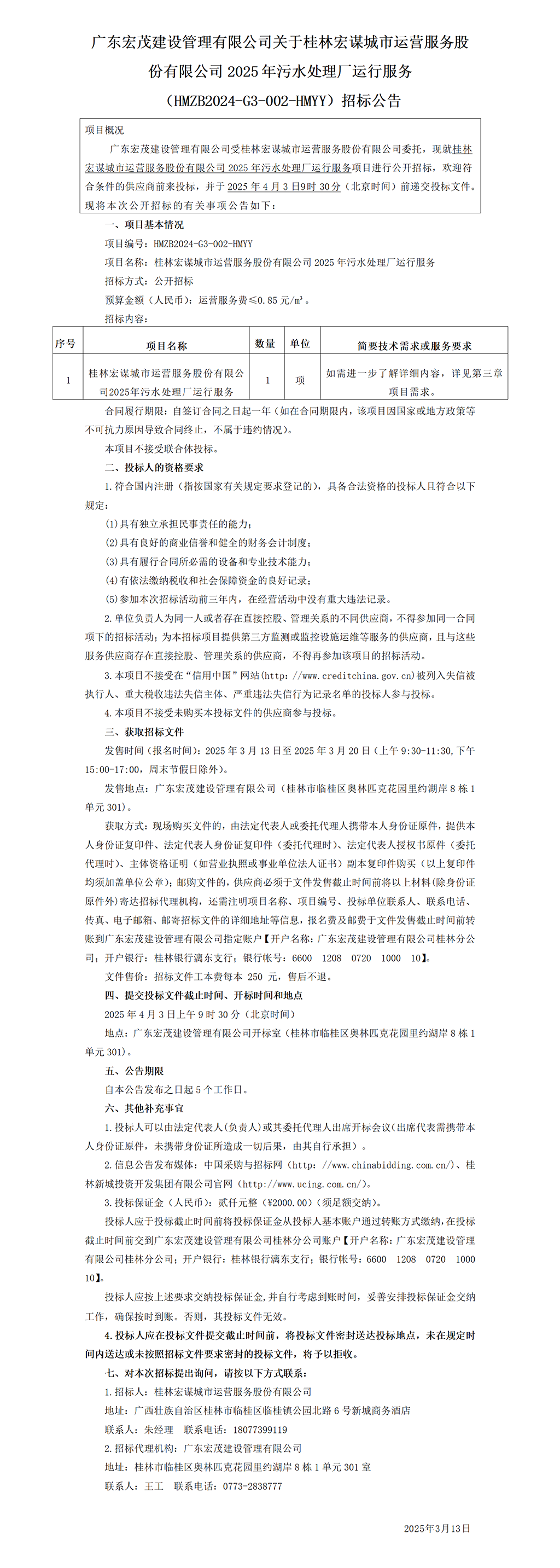 廣東宏茂建設(shè)管理有限公司關(guān)于桂林宏謀城市運(yùn)營(yíng)服務(wù)股份有限公司2025年污水處理廠運(yùn)行服務(wù)(HMZB2024-G3-002-HMYY)招標(biāo)公告