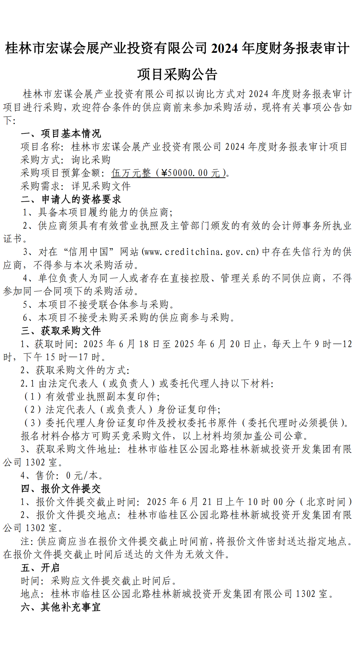 桂林市宏謀會(huì)展產(chǎn)業(yè)投資有限公司2024年度財(cái)務(wù)報(bào)表審計(jì)項(xiàng)目采購(gòu)公告