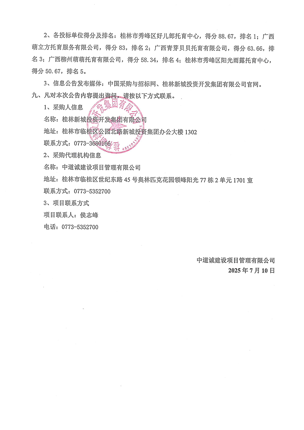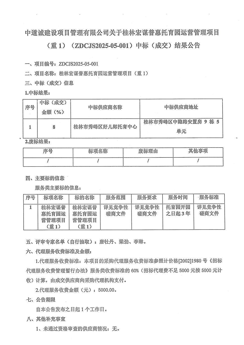 中道誠(chéng)建設(shè)項(xiàng)目管理有限公司關(guān)于桂林宏謀普惠托育園運(yùn)營(yíng)管理項(xiàng)目(重1)(ZDCJS2025-05-001)中標(biāo)(成交)結(jié)果公告