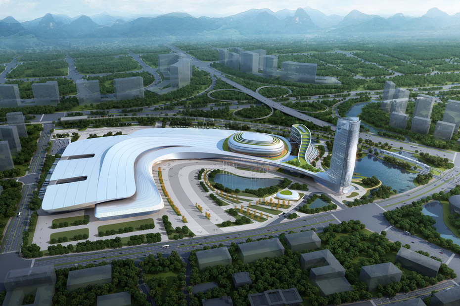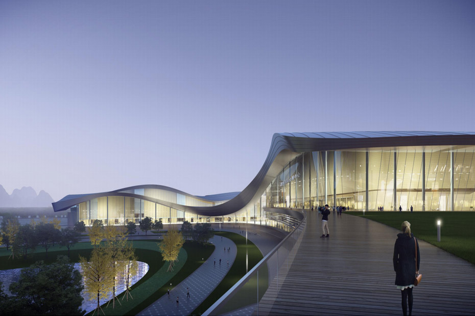 桂林國(guó)際會(huì)展中心是集會(huì)議、會(huì)展、商業(yè)、接待為一體的大型綜合性建筑,規(guī)劃用地面積約750畝,一期總建筑面積約39.7萬平方米,其中一期室內(nèi)凈展面積為6萬平方米,室外展面積為5萬平方米,會(huì)議中心凈使用面積約1.5萬平方米,第一接待中心(四星標(biāo)準(zhǔn),含350間客房)以及第二接待中心(五星標(biāo)準(zhǔn),含450間客房)。